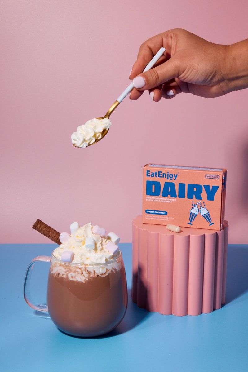 EatEnjoy® Dairy is here to change that. Packed with a powerful blend of proteolytic enzymes, it helps your body break down dairy as you eat - so you can enjoy all the creamy, cheesy, milky goodness without the post-meal regret.